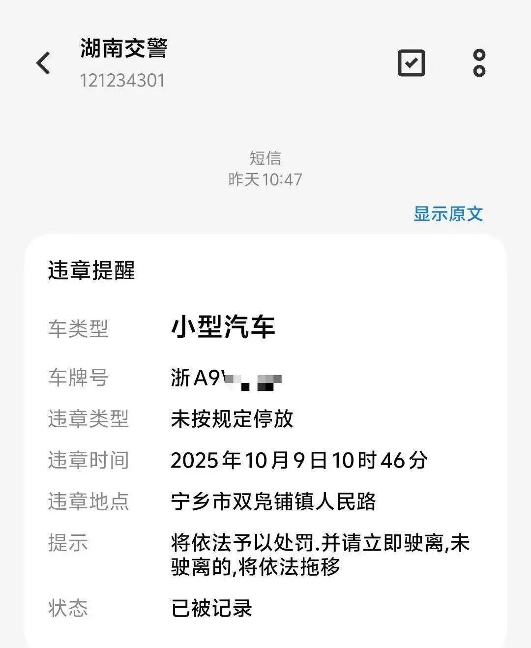 10月9日上午,她收到了一条来自湖南交警的短信,大致内容是:您的小型汽车浙A9****于2025年10月9日10时46分在宁乡市双凫铺镇人民路未按规定停放已被记录,将依法予以处罚。请立即驶离,未驶离将依法拖移。